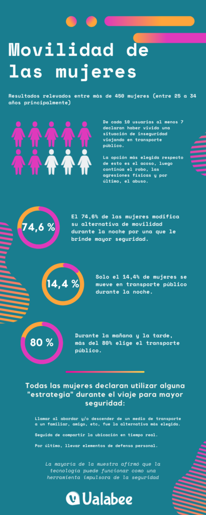 Más de la mitad de las mujeres de la encuesta realizada por Ualabee durante octubre y noviembre del 2021, declaró haber vivido una situación de inseguridad viajando en transporte público, entre las que se destaca al acoso – a 332 representantes de la muestra les sucedió alguna vez – seguido de robos, agresiones físicas y abuso.